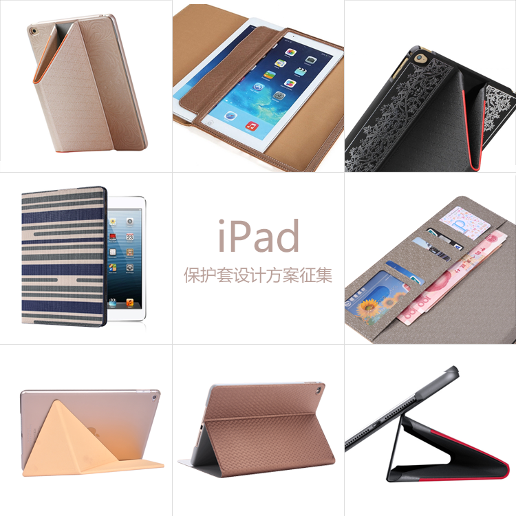1、參照下方圖片所示iPad保護(hù)套款式,設(shè)計(jì)保護(hù)套外觀,例如卡通圖案,色彩拼接,文字組合等;