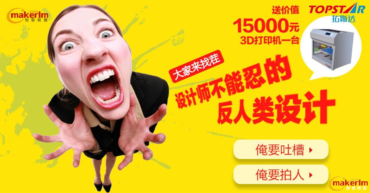 5.15日至5月31日,創(chuàng)客聯(lián)盟與上市公司拓斯達共同舉辦大家來找茬:設計師不能忍的反人類設計活動,贏取最終大獎價值1.5萬元的3D打印機一臺,同時每日選吐槽TOP1,免費3D打印另傳3D模型,一共15名,下面實況直播打印詳情,揭露打印細節(jié)。
